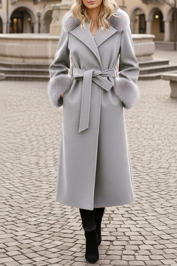 - Το μοντέλο έχει κλασικό σχέδιο, ζώνη από το ίδιο ύφασμα και μεγάλη γιακά με γούνα και μανσέτες.