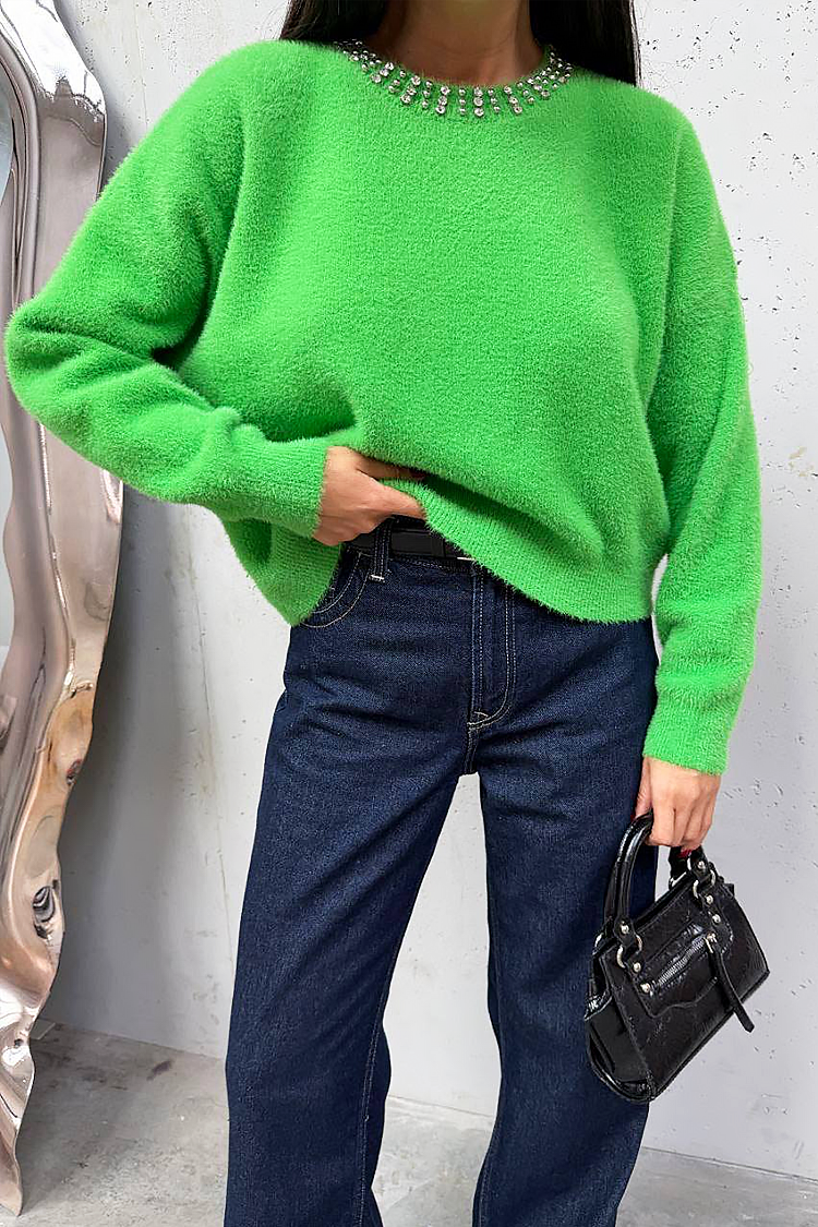 - Με άνετη γραμμή, μακριά μανίκια και όμορφο διακοσμητικό στοιχείο με πέτρες γύρω από την λαιμόκοψη.
