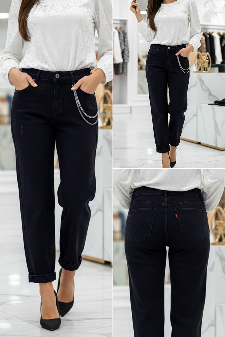 - Το μοντέλο έχει ψηλή μέση, άνετη γραμμή, τσέπες και διακοσμητική αλυσίδα για στυλάτη πινελιά.