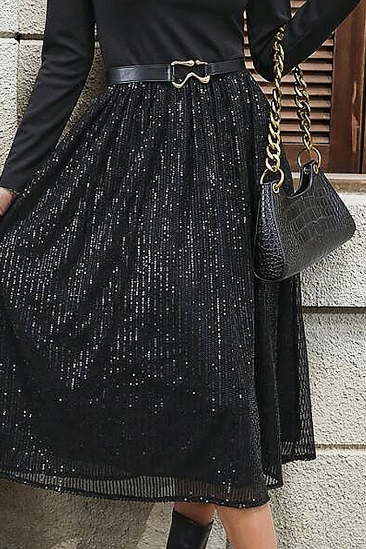 - Το φόρεμα έχει άνετη γραμμή, στρογγυλή λαιμόκοψη και παγιέτες στο κάτω μέρος.