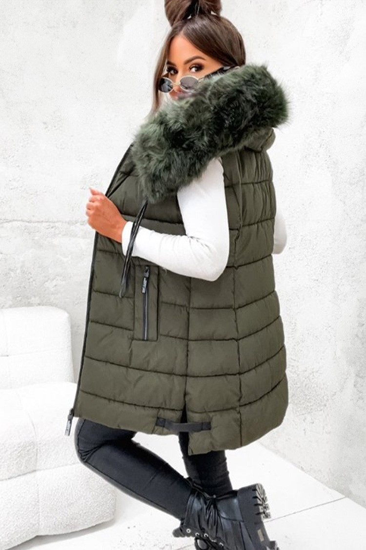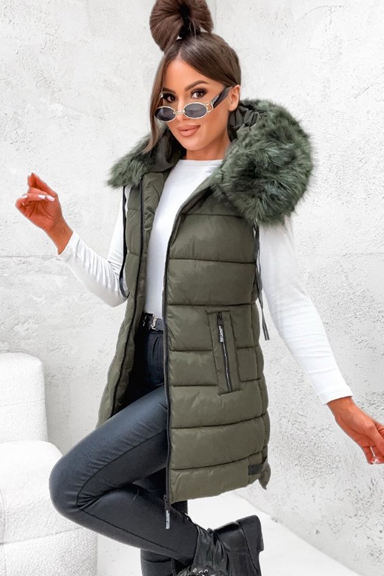 - Το γιλέκο έχει κλασική γραμμή, άνετη κουκούλα με πούπουλο και μακρύ μήκος.