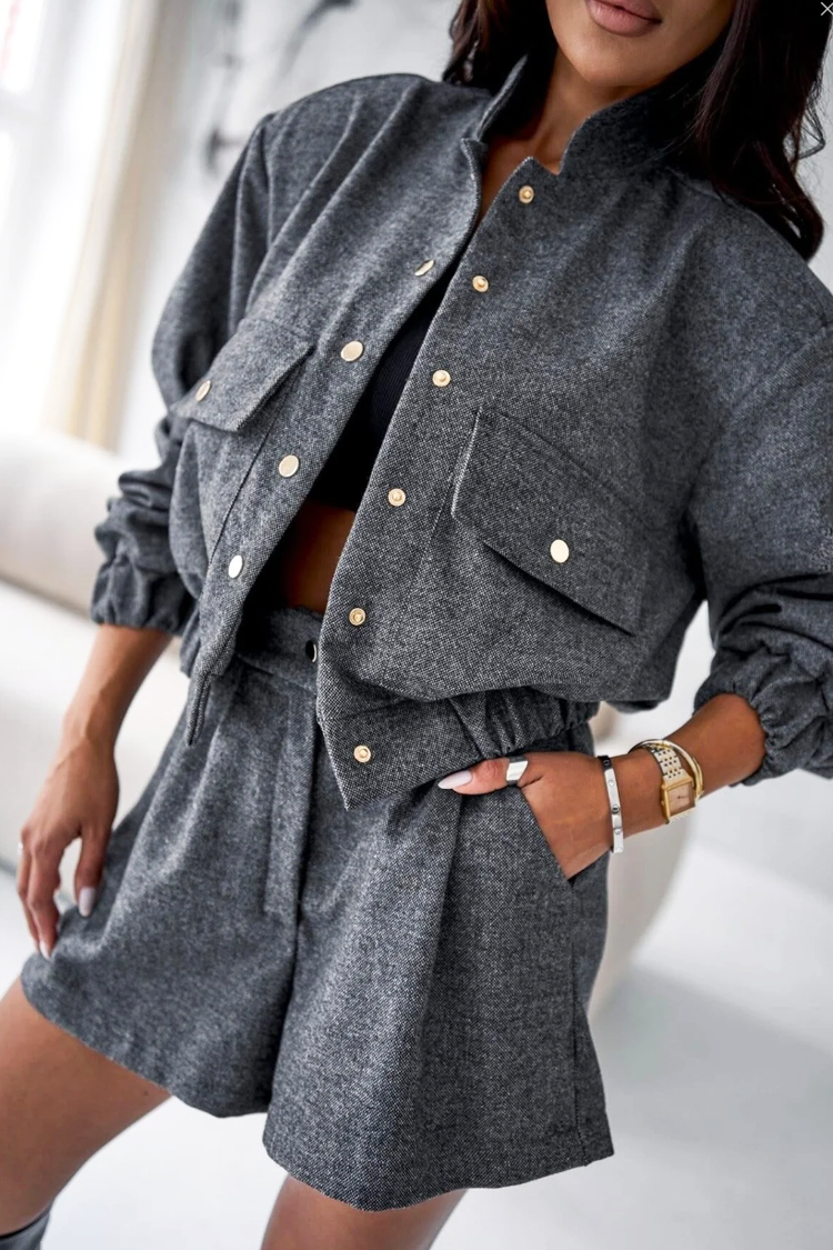 - Το μπουφάν είναι μεταβατικό, με κλασική γραμμή και κουμπιά, ενώ το σορτσάκι έχει κομψό σχεδιασμό και τσέπες.