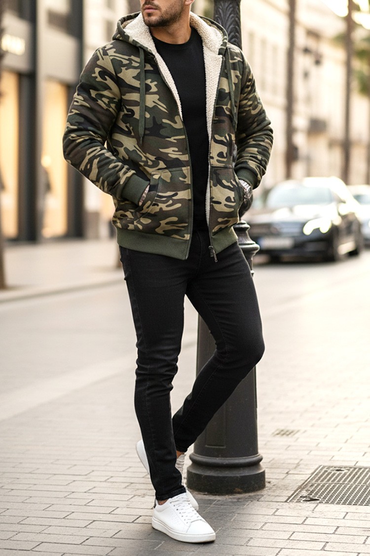 - Πρακτικό και άνετο ανδρικό φούτερ με καμουφλάζ σχέδιο και αφράτη φόδρα, κατάλληλο για καθημερινή χρήση.