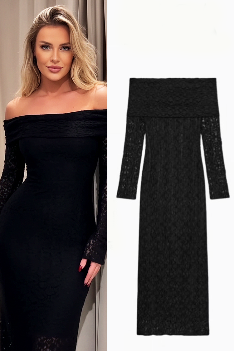 - Το φόρεμα έχει εφαρμοστή γραμμή, πεσμένους ώμους, μακριά μανίκια και δαντέλα.