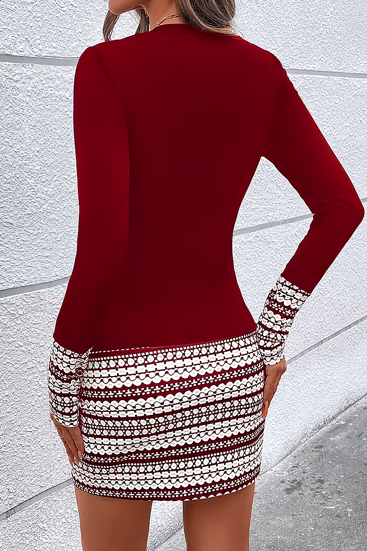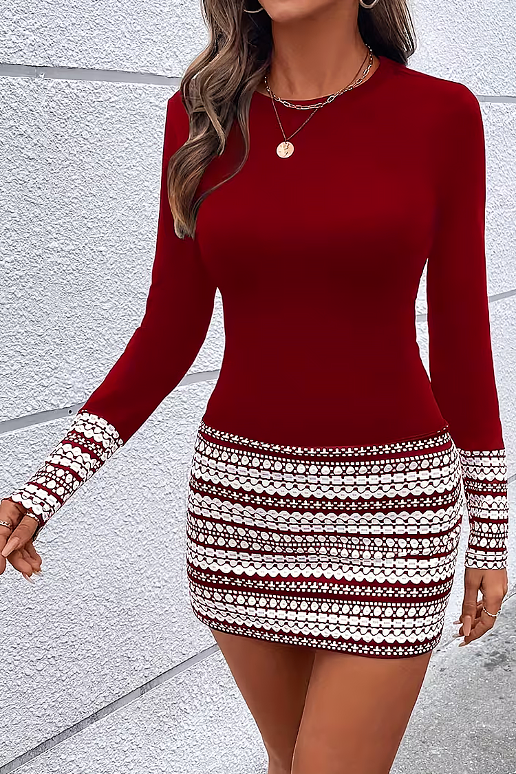 - Το φόρεμα έχει άνετη γραμμή, μακριά μανίκια και δίχρωμο μοτίβο.