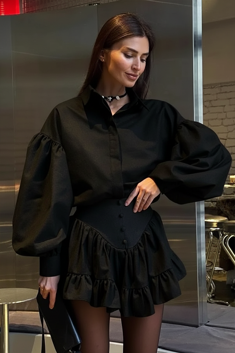 - Το πουκάμισο έχει ελεύθερη γραμμή και φαρδιά μανίκια.