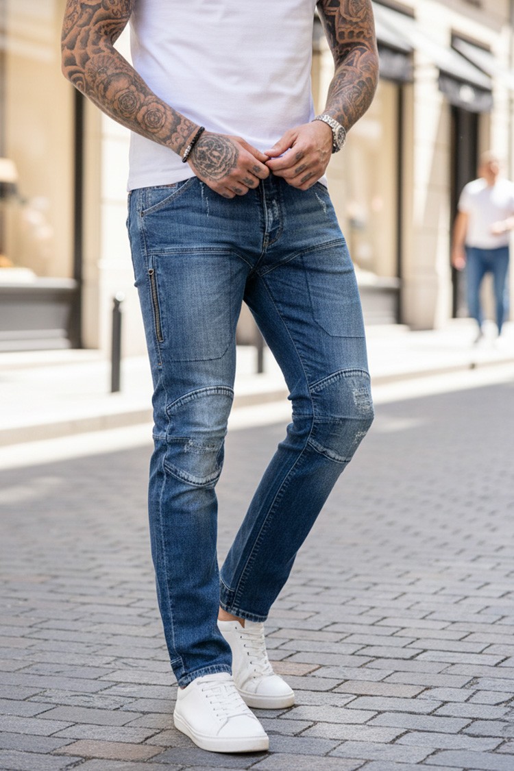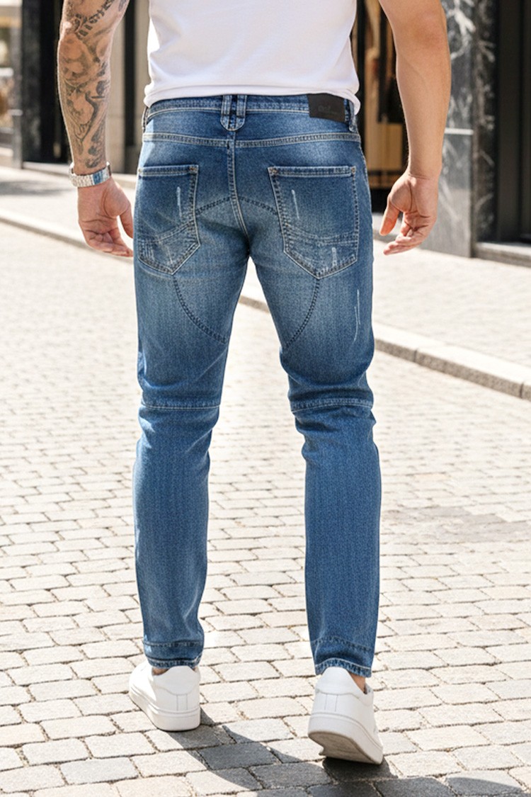 - Πρακτικό μοντέλο τζιν με διακοσμητικές ραφές και φθορές στα μπατζάκια, κατάλληλο για καθημερινή χρήση.