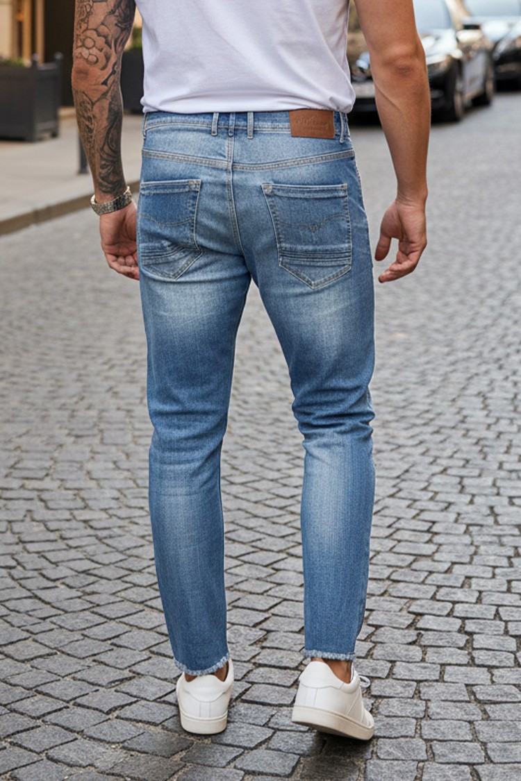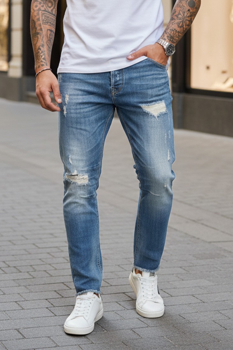 - Πρακτικό μοντέλο τζιν με διακοσμητικά σκισίματα και φθορές στα μπατζάκια, κατάλληλο για καθημερινή χρήση.