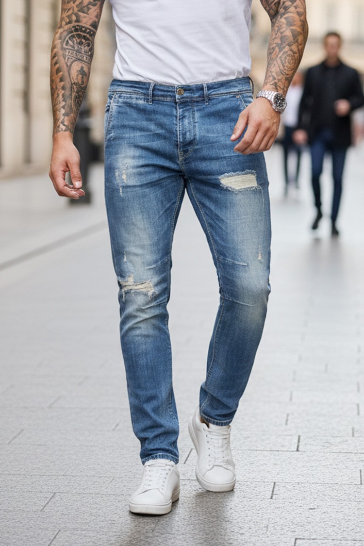 - Πρακτικό μοντέλο τζιν με διακοσμητικά σκισίματα και φθορές στα μπατζάκια, κατάλληλο για καθημερινή χρήση.
