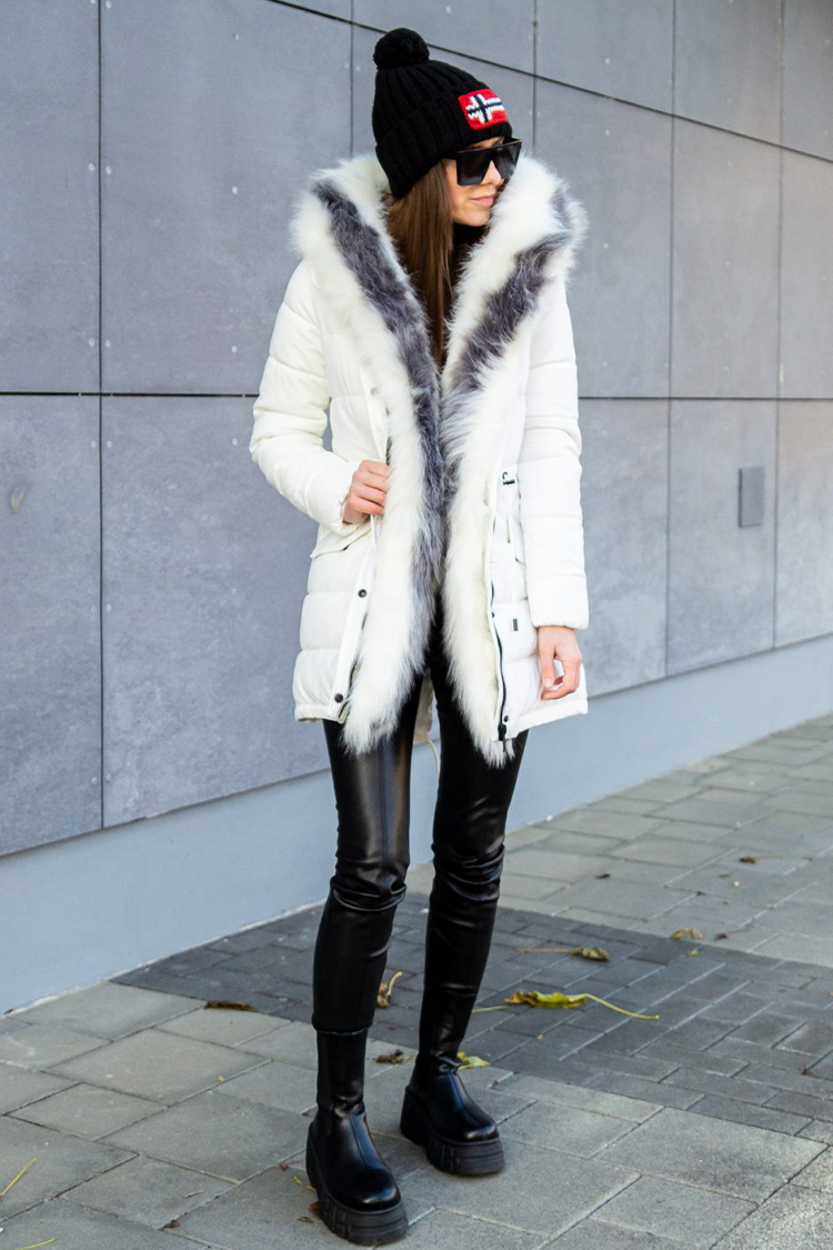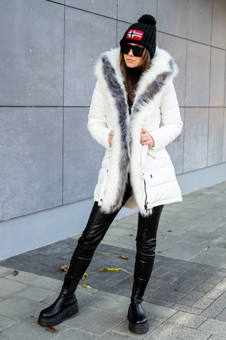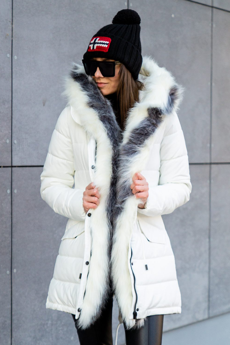 - Το μοντέλο έχει άνετη γραμμή, κλείσιμο με φερμουάρ και κουμπιά και διαθέτει μεγάλη κουκούλα με πούπουλα σε όλο το μήκος.