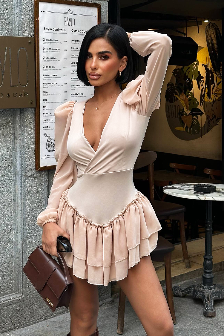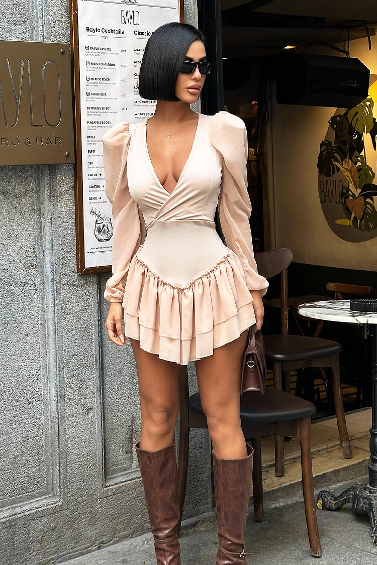 - Για την τέλεια εμφάνιση, επιλέξτε αυτό το κοντό φόρεμα με ελκυστικό σχέδιο σε μπεζ χρώμα.