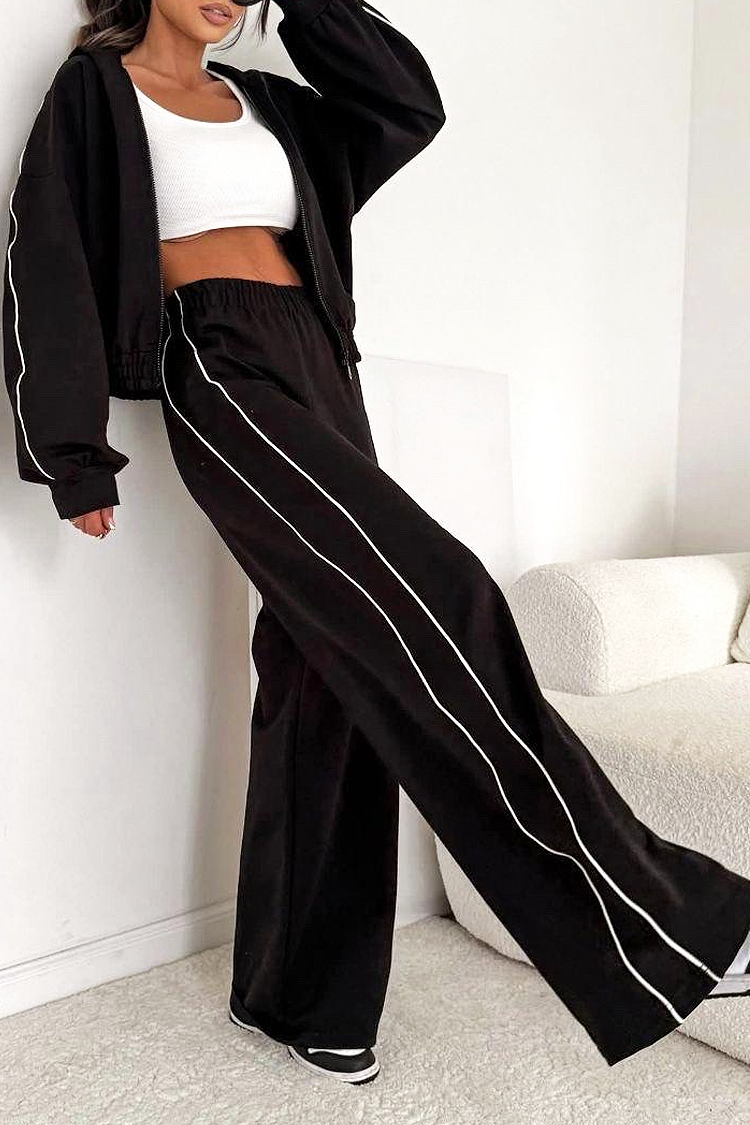 - Το φούτερ έχει φερμουάρ και κουκούλα, ενώ το παντελόνι έχει ψηλή μέση και φαρδιά μπατζάκια.
