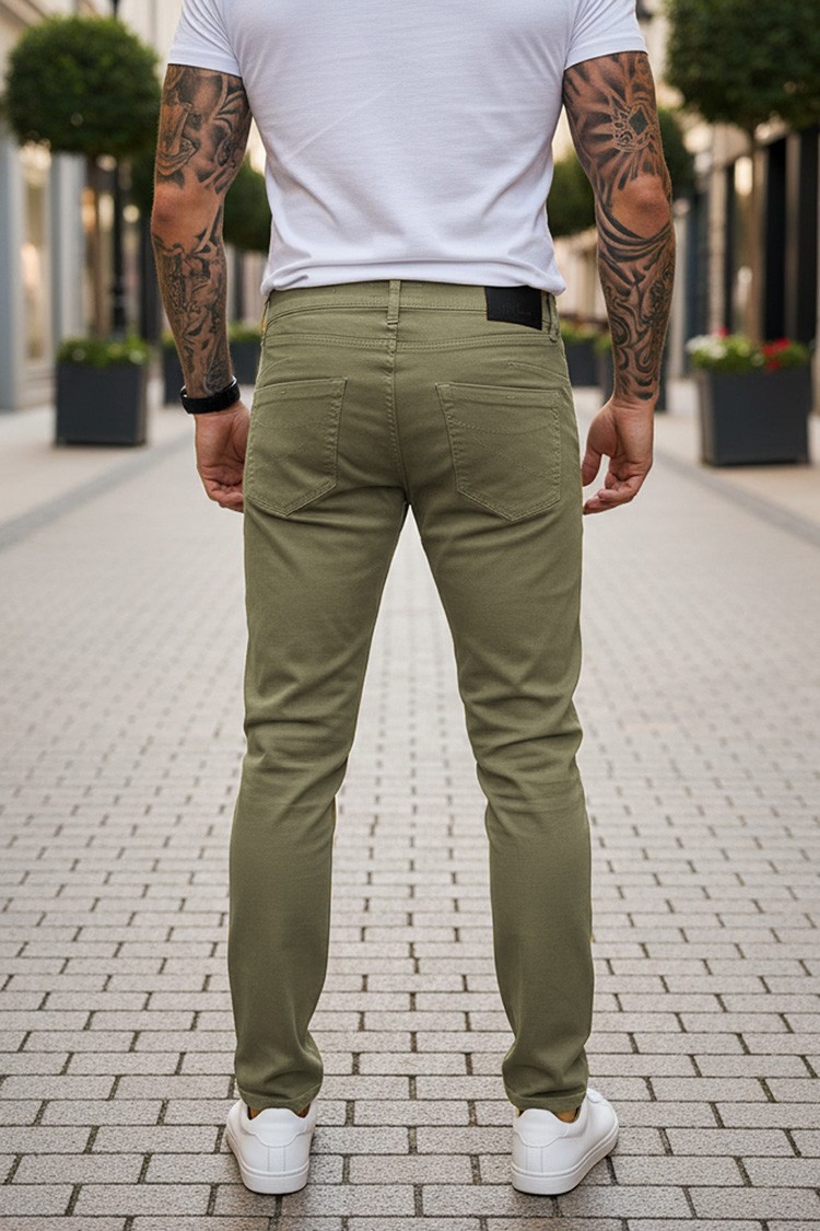 - Ανδρικό chino παντελόνι σε χακί χρώμα με γυρισμένα μπατζάκια, κατάλληλο τόσο για καθημερινή όσο και για πιο κομψή εμφάνιση.