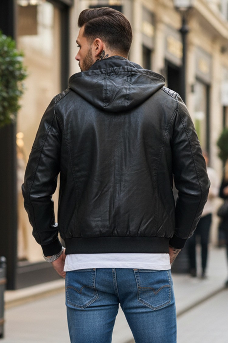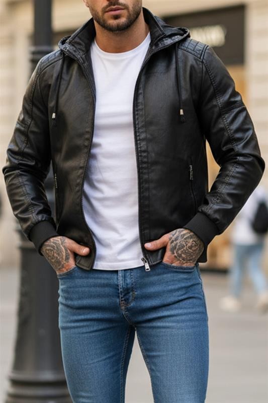 - Ανδρικό μπουφάν με επωμίδες και κουκούλα με κορδόνια σε μαύρο χρώμα, κατάλληλο για καθημερινή χρήση.