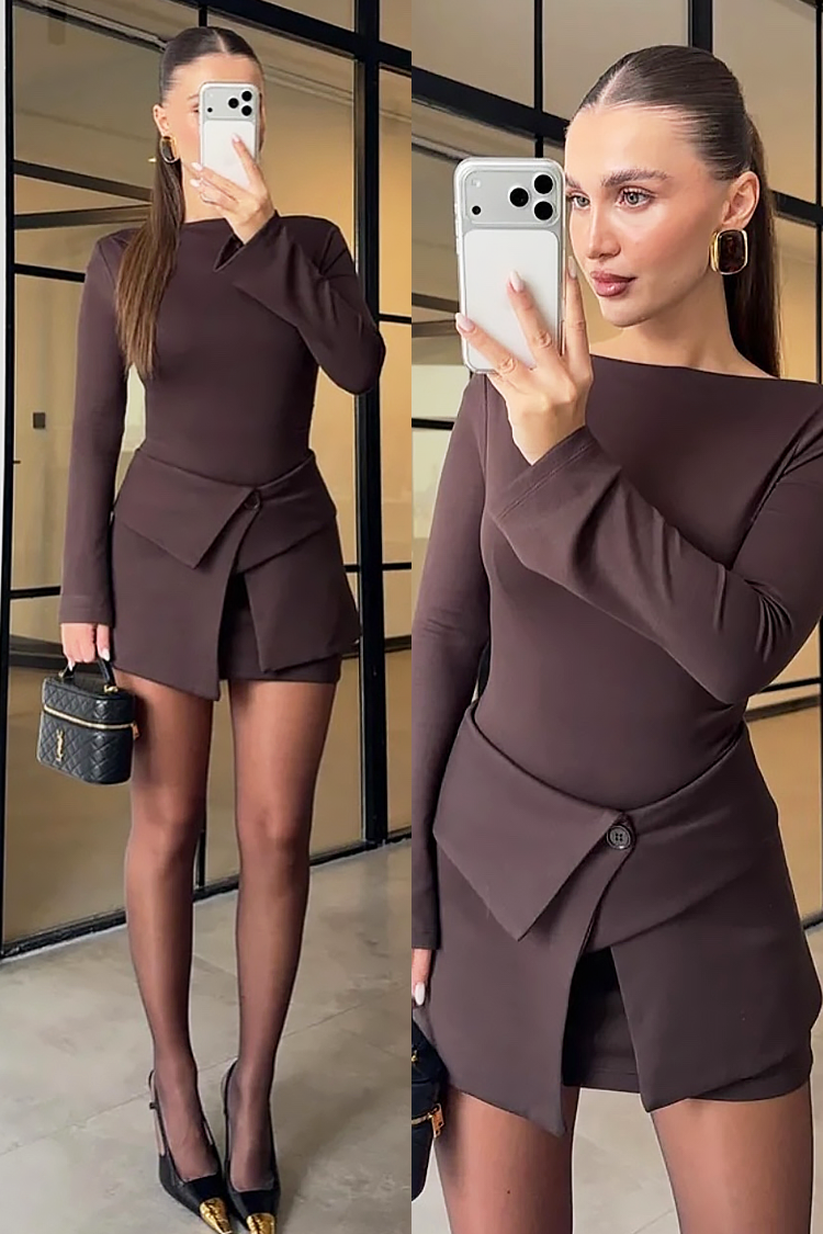- Το φόρεμα έχει γραμμή που αγκαλιάζει το σώμα, ενώ η φούστα έχει κουμπί μπροστά.