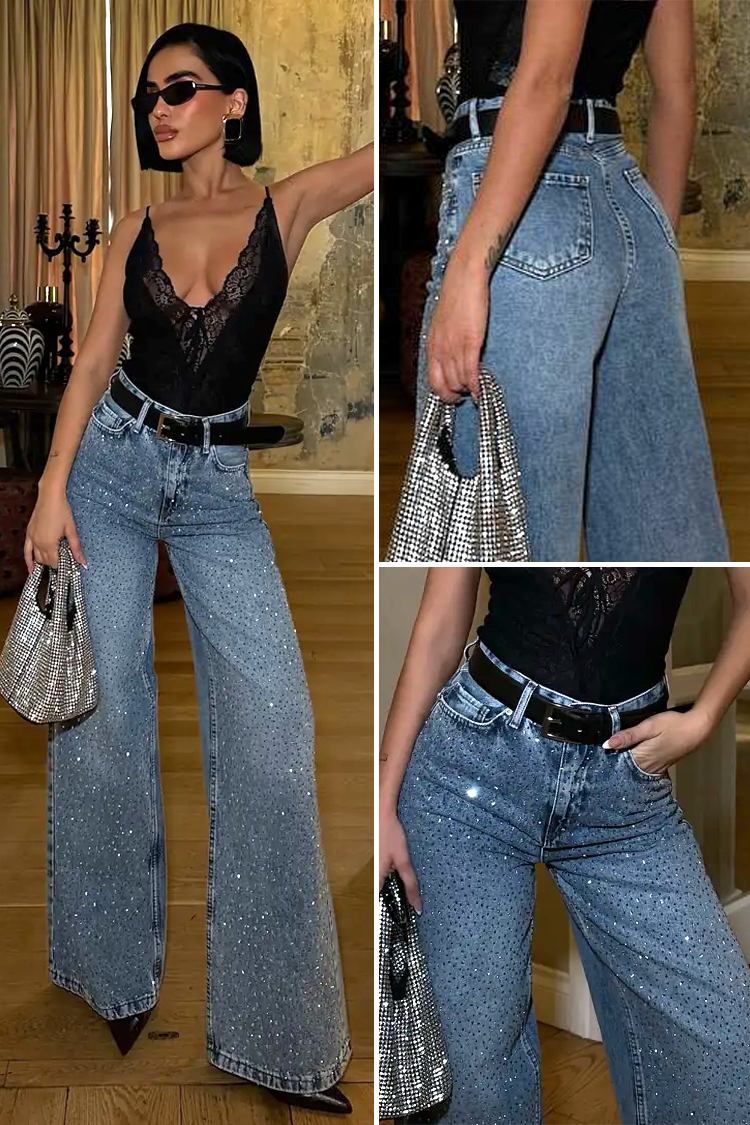 - Το μοντέλο έχει ψηλή μέση, φαρδιά μπατζάκια και γυαλιστερά, διακοσμητικά στοιχεία.