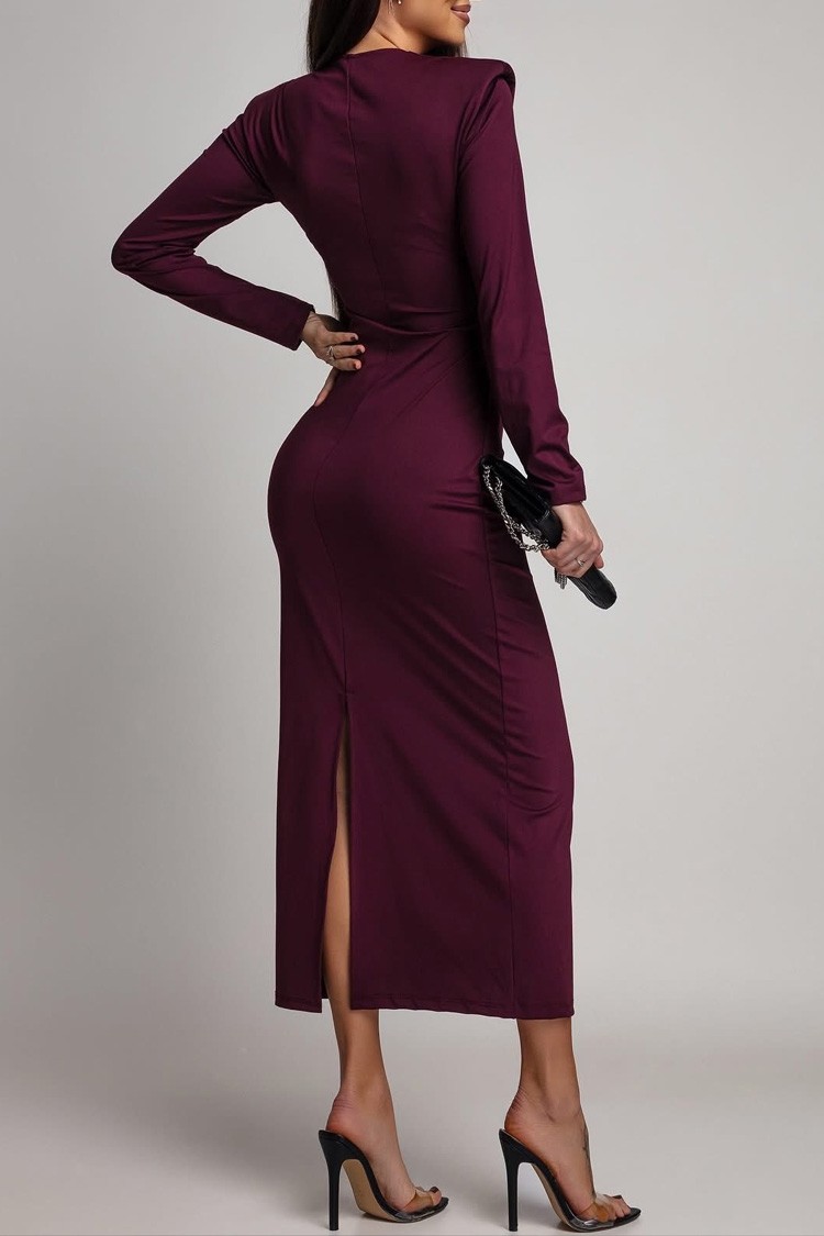 - Το μοντέλο έχει εντυπωσιακή λαιμόκοψη με μεταλλικό στοιχείο, μακριά μανίκια και σκίσιμο στο πίσω μέρος.
