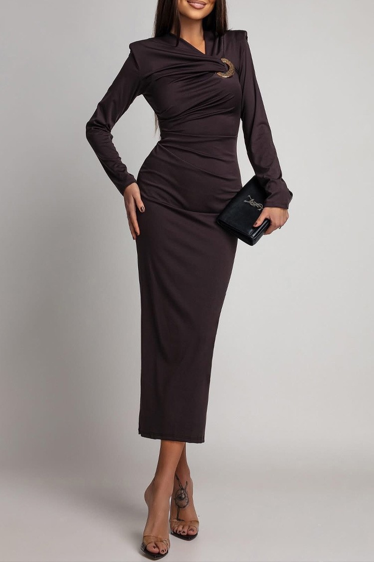 - Το μοντέλο έχει εντυπωσιακή λαιμόκοψη με μεταλλικό στοιχείο, μακριά μανίκια και σκίσιμο στο πίσω μέρος.