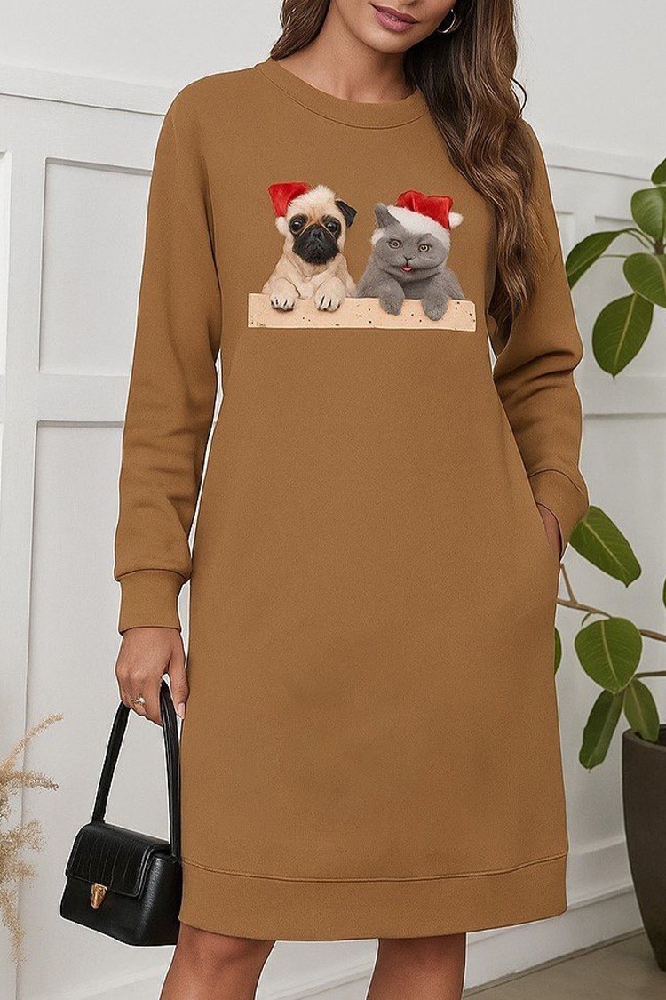 - Το φόρεμα έχει άνετη και ελεύθερη γραμμή, μακριά μανίκια και χριστουγεννιάτικο σχέδιο.