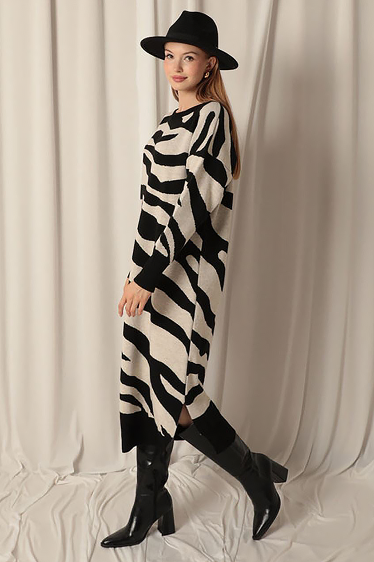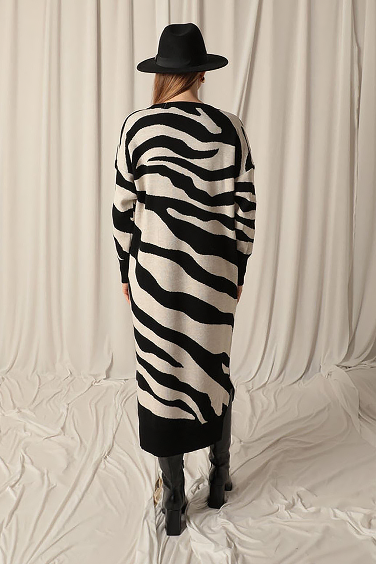 - Το μοντέλο έχει κλασική και ελεύθερη γραμμή, μακριά μανίκια και μοτίβο ζέβρα.