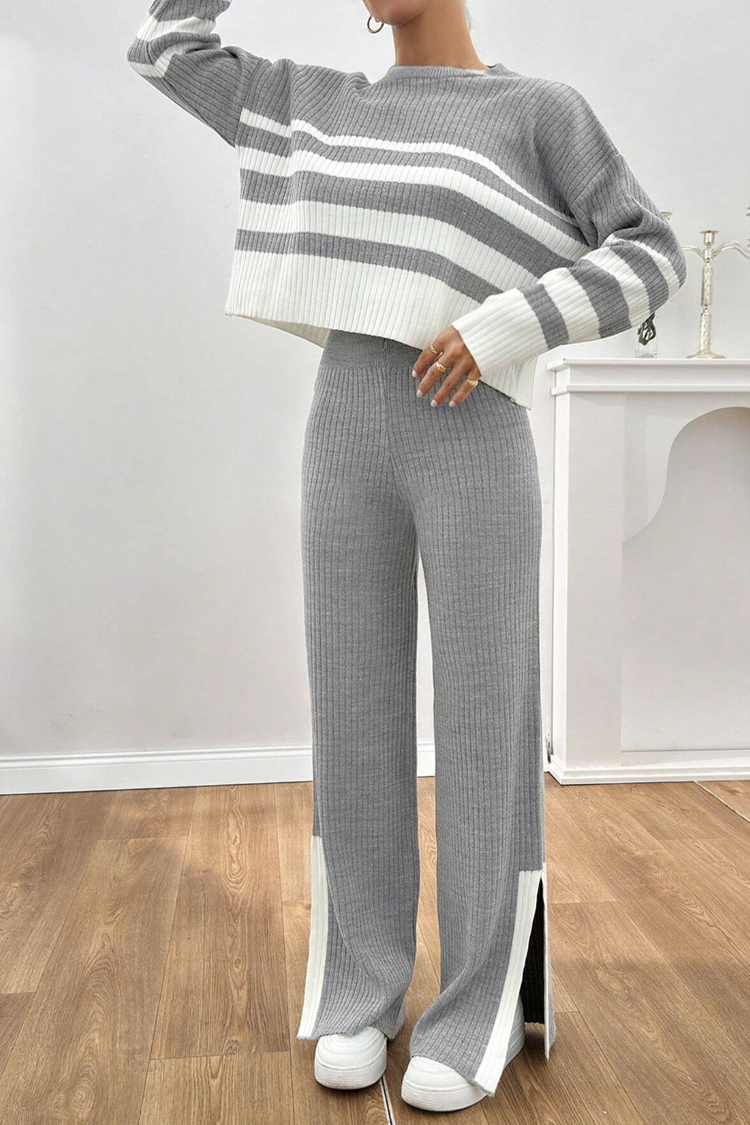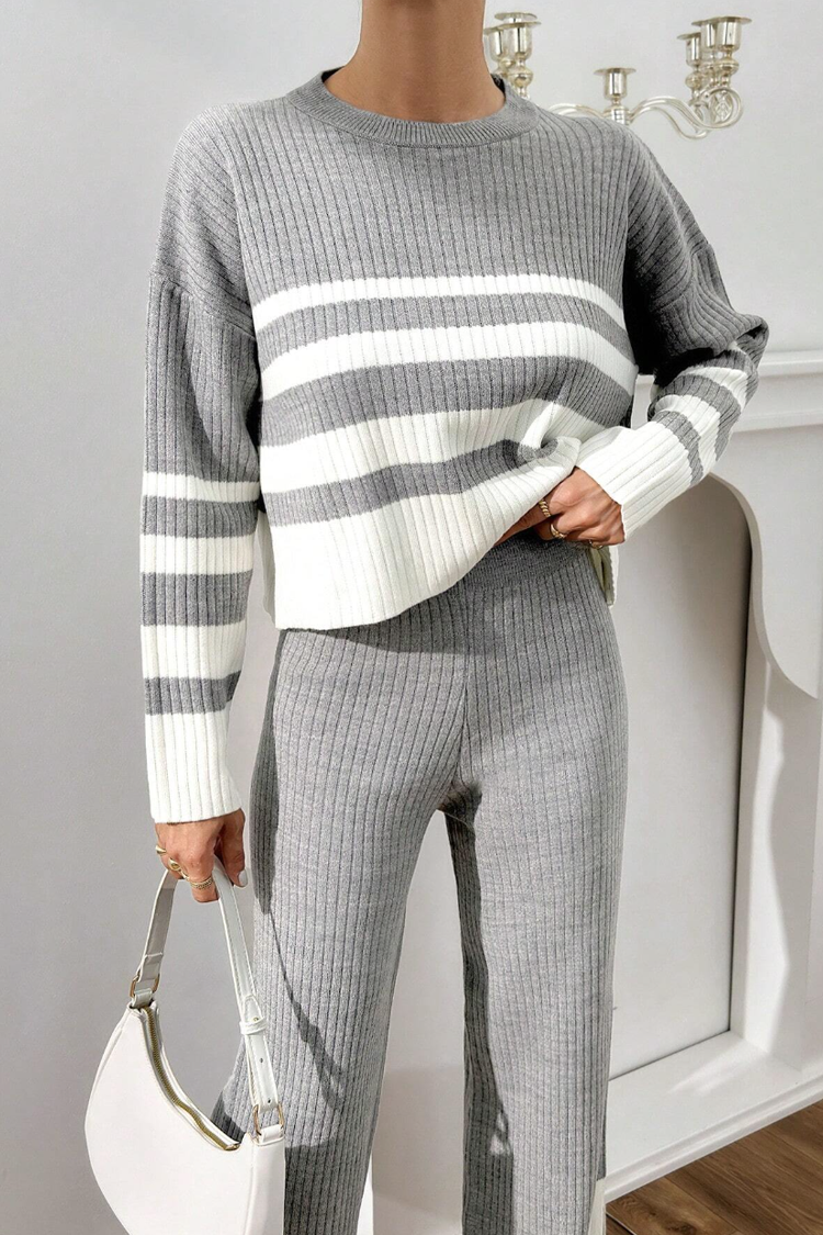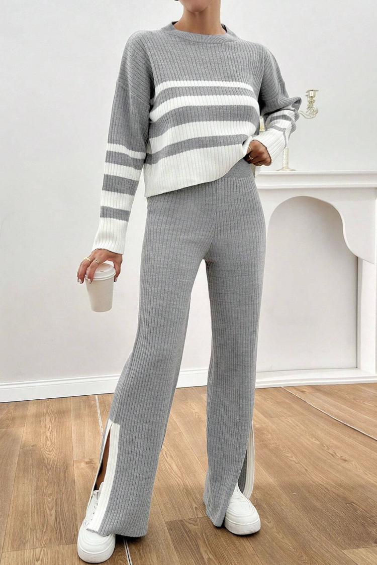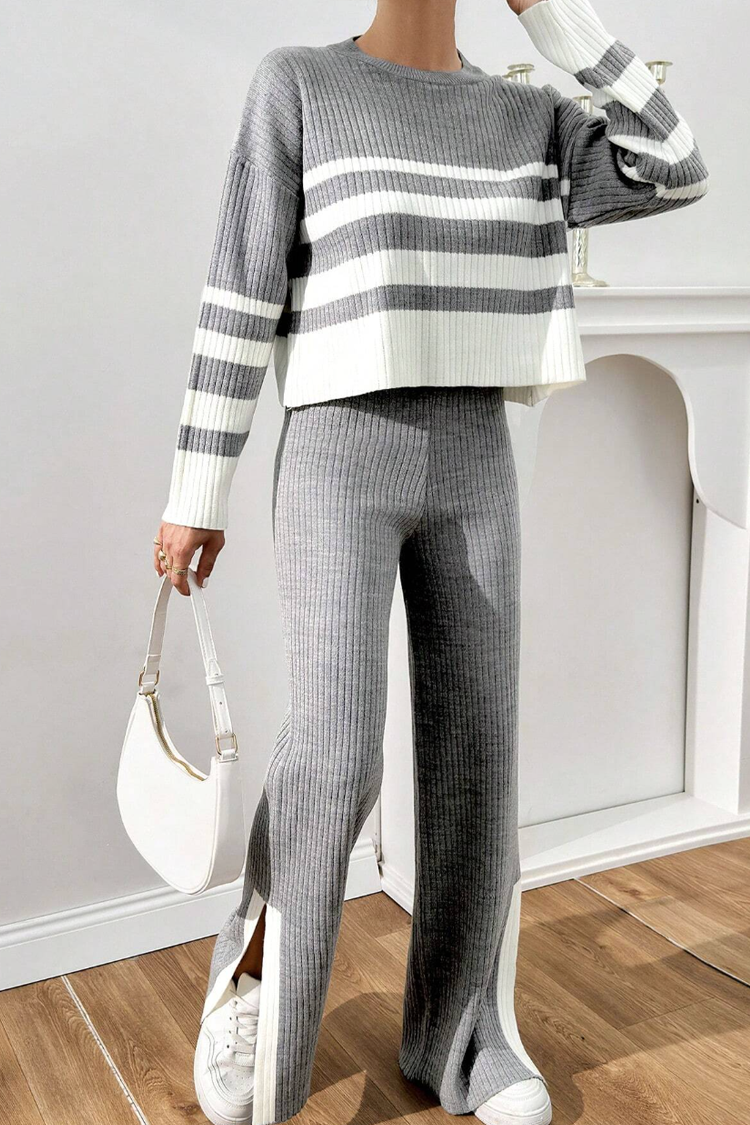 - Το πουλόβερ έχει κλασική γραμμή, ενώ το παντελόνι έχει ψηλή μέση και εντυπωσιακά μπατζάκια.
