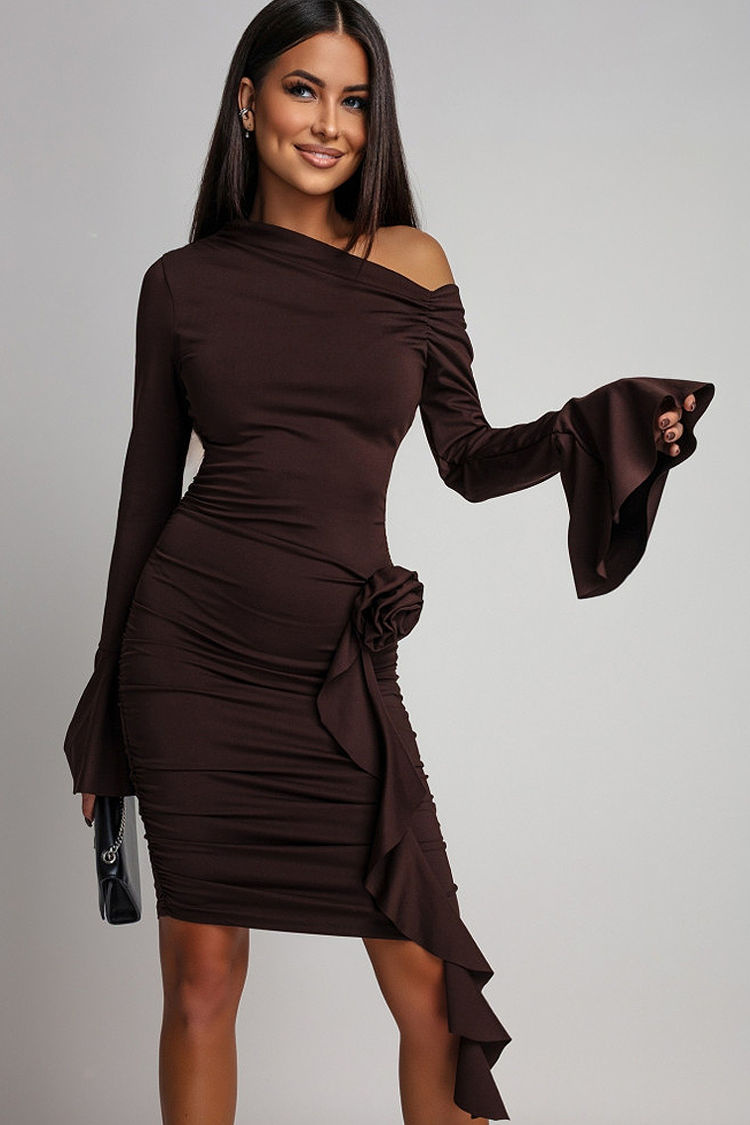 - Το μοντέλο έχει μονόχρωμο σχέδιο, μακριά μανίκια, εφαρμοστή γραμμή, πεσμένους ώμους και εντυπωσιακό τριαντάφυλλο στη μέση.
