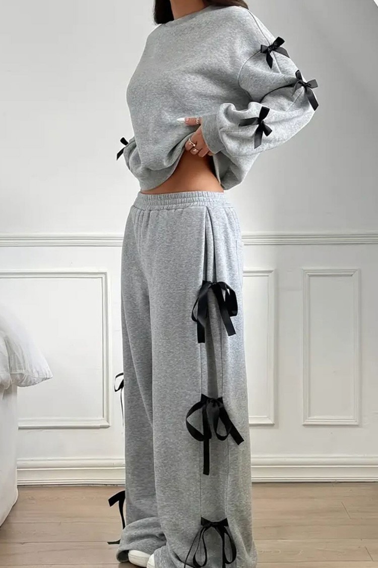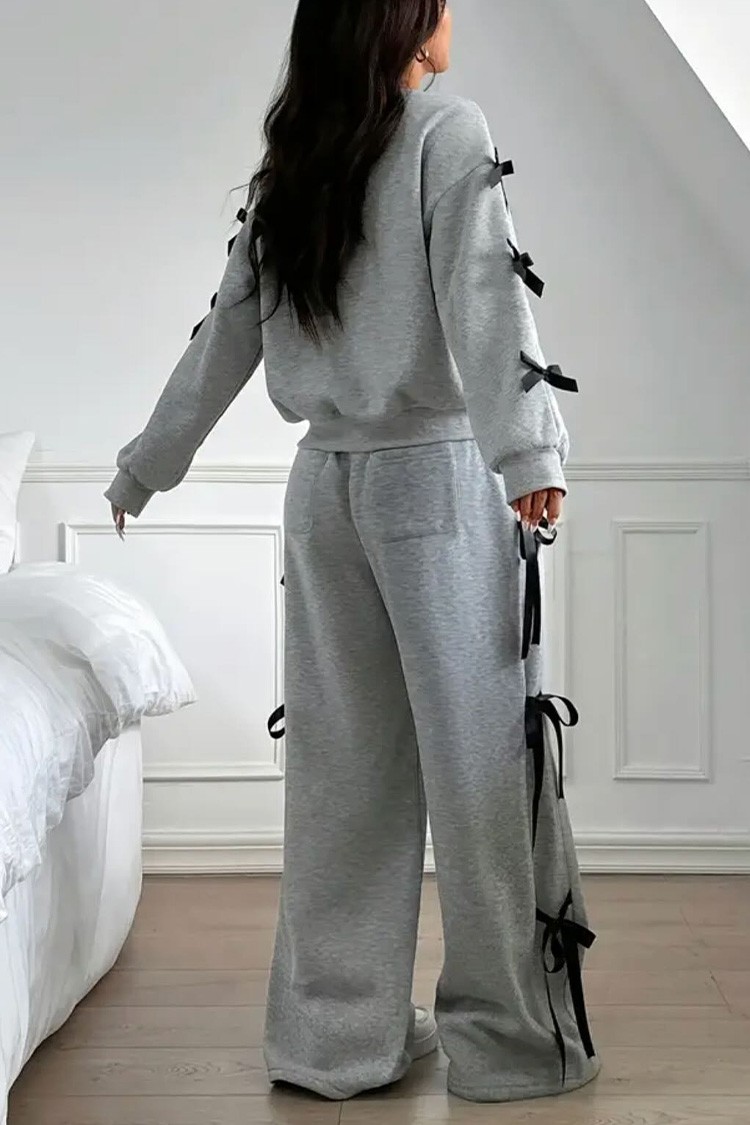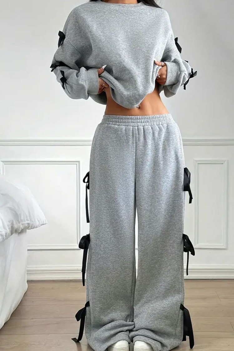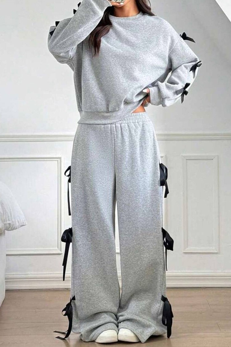 - Το σετ αποτελείται από μια oversize μπλούζα και ένα παντελόνι με ελεύθερη γραμμή και κορδέλες σε όλο το μήκος.