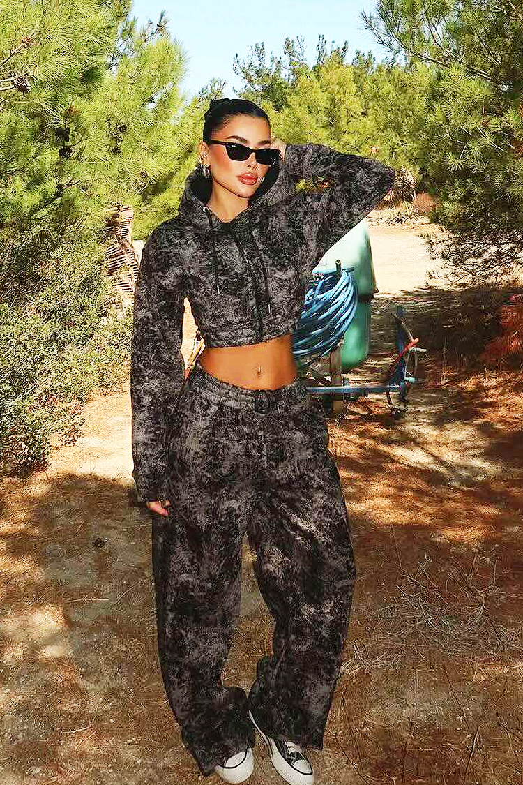 - Το φούτερ είναι κοντό, με κουκούλα και φερμουάρ, ενώ το παντελόνι έχει ελεύθερη γραμμή.