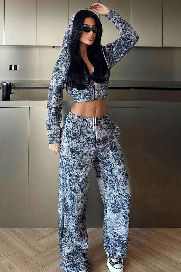 - Το φούτερ είναι κοντό, με κουκούλα και φερμουάρ, ενώ το παντελόνι έχει ελεύθερη γραμμή.