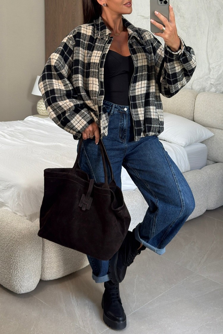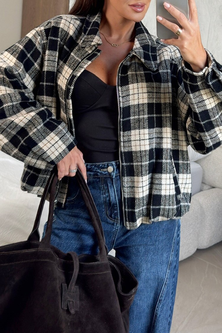 - Το μοντέλο έχει άνετη γραμμή, καρό σχέδιο και κλείνει με φερμουάρ μπροστά.