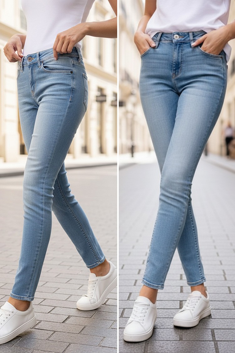 - Basic μοντέλο γυναικείων τζιν σε ανοιχτό μπλε χρώμα με ξεθωριασμένο εφέ, κατάλληλο για καθημερινή χρήση ή βόλτα.