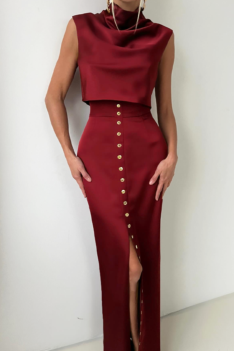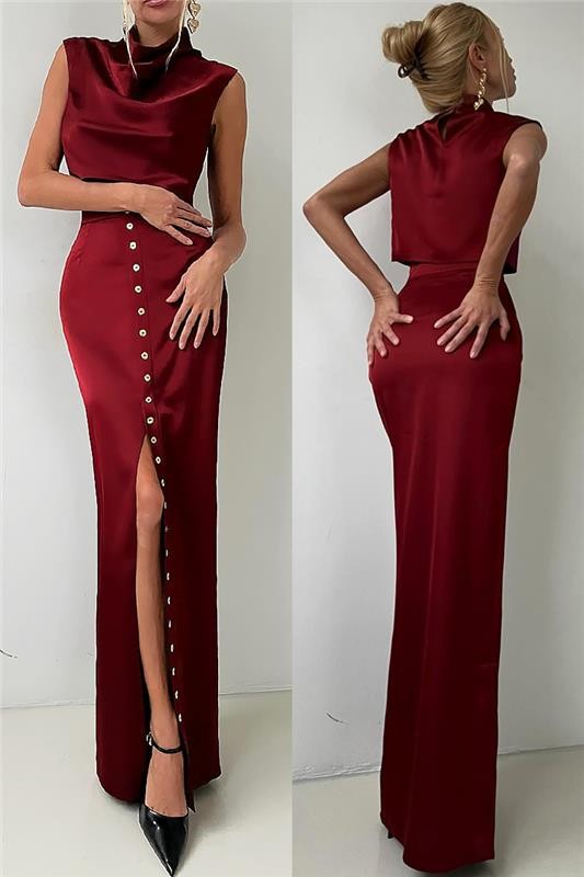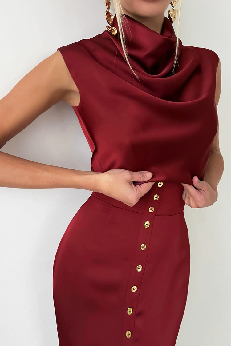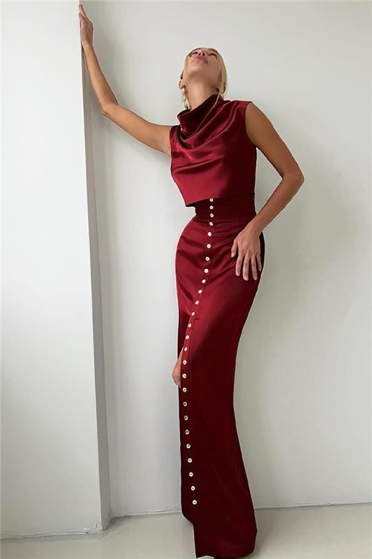 - Η φούστα έχει ψηλή μέση, ίσια γραμμή και κουμπιά κατά μήκος, που επιτρέπουν να φορεθεί και με σκίσιμο.