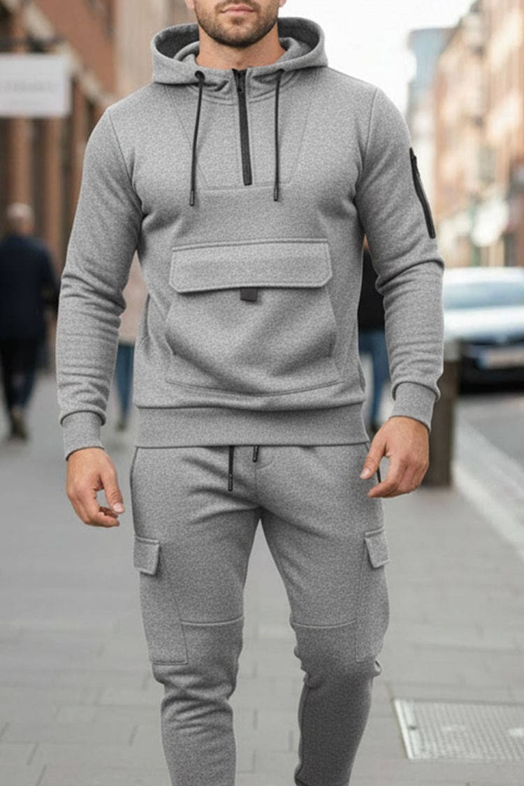 - Άνετο ανδρικό σετ σε μαύρο χρώμα από δύο κομμάτια, που αποτελείται από φούτερ και παντελόνι.
