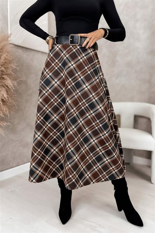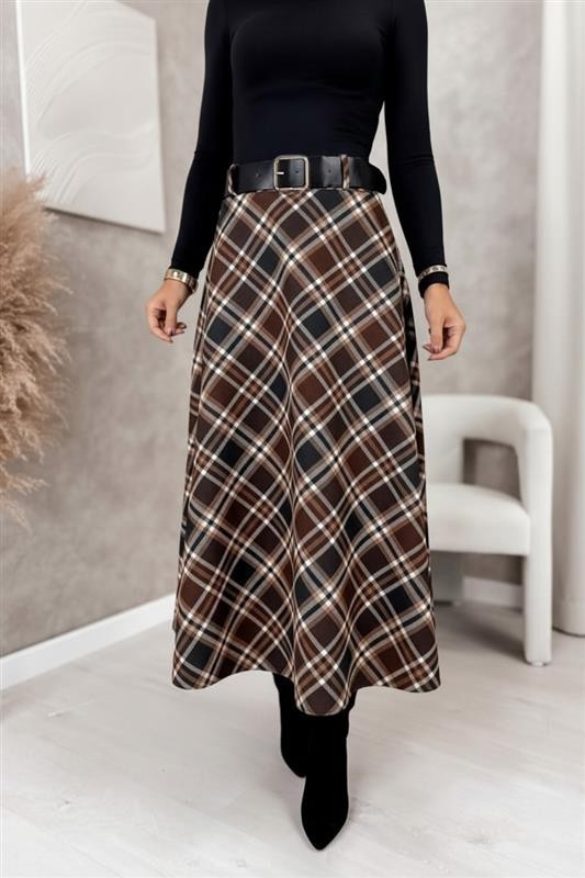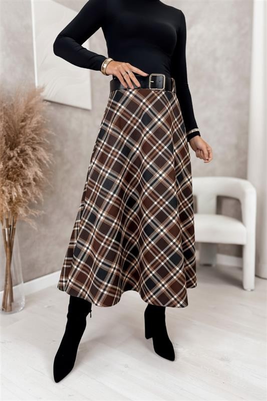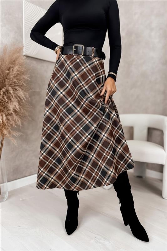 - Το μοντέλο έχει ψηλή μέση, ζώνη από οικολογικό δέρμα και εντυπωσιακό καρό σχέδιο.
