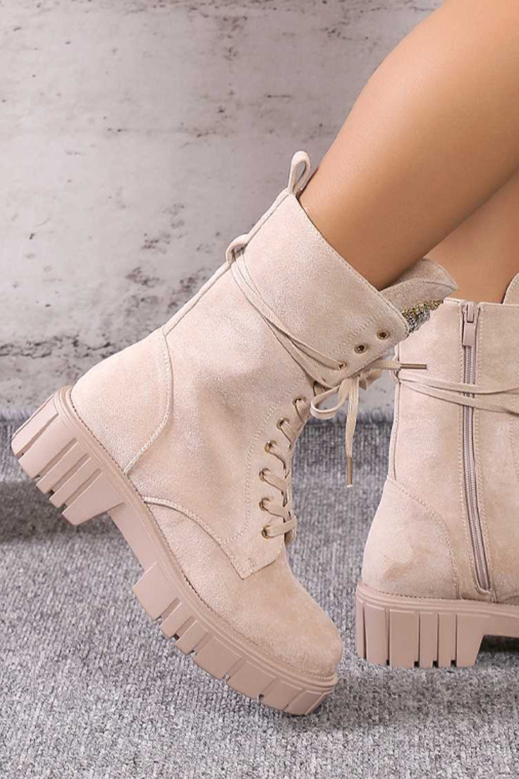 - Για να νιώθετε άνετα, αλλά και κομψά, επιλέξτε αυτά τα γυναικεία μποτάκια σε μπεζ χρώμα.