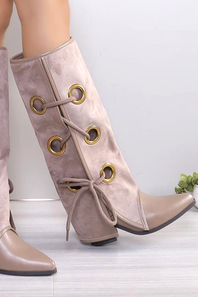 - Κομψό και μοντέρνο μοντέλο γυναικείων μποτών με χοντρό τακούνι από οικολογικό δέρμα σε μπεζ χρώμα.