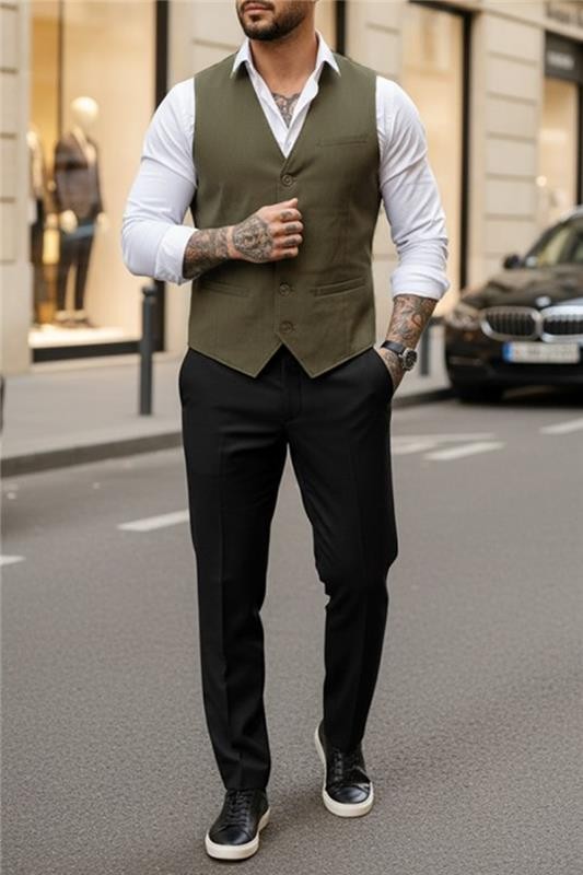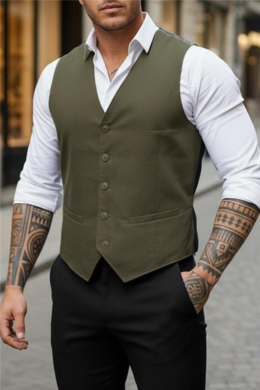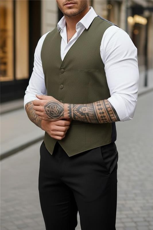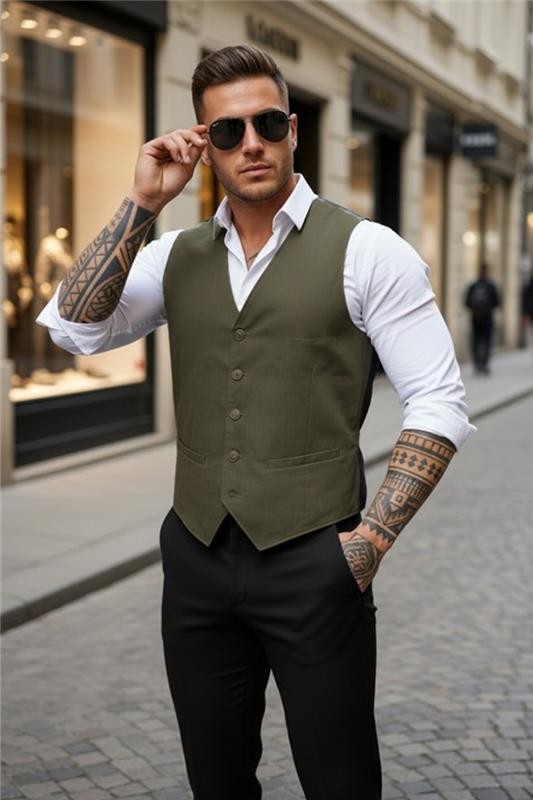 - Κομψό ανδρικό γιλέκο με λαιμόκοψη σε σχήμα V και κουμπιά κατά μήκος σε χρώμα χακί.