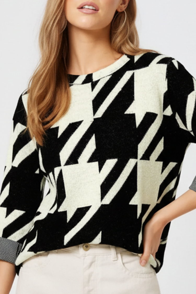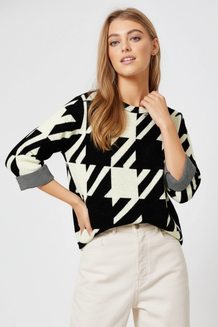 - Το μοντέλο έχει άνετη γραμμή, στρόγγυλη λαιμόκοψη και ασπρόμαυρο σχέδιο.