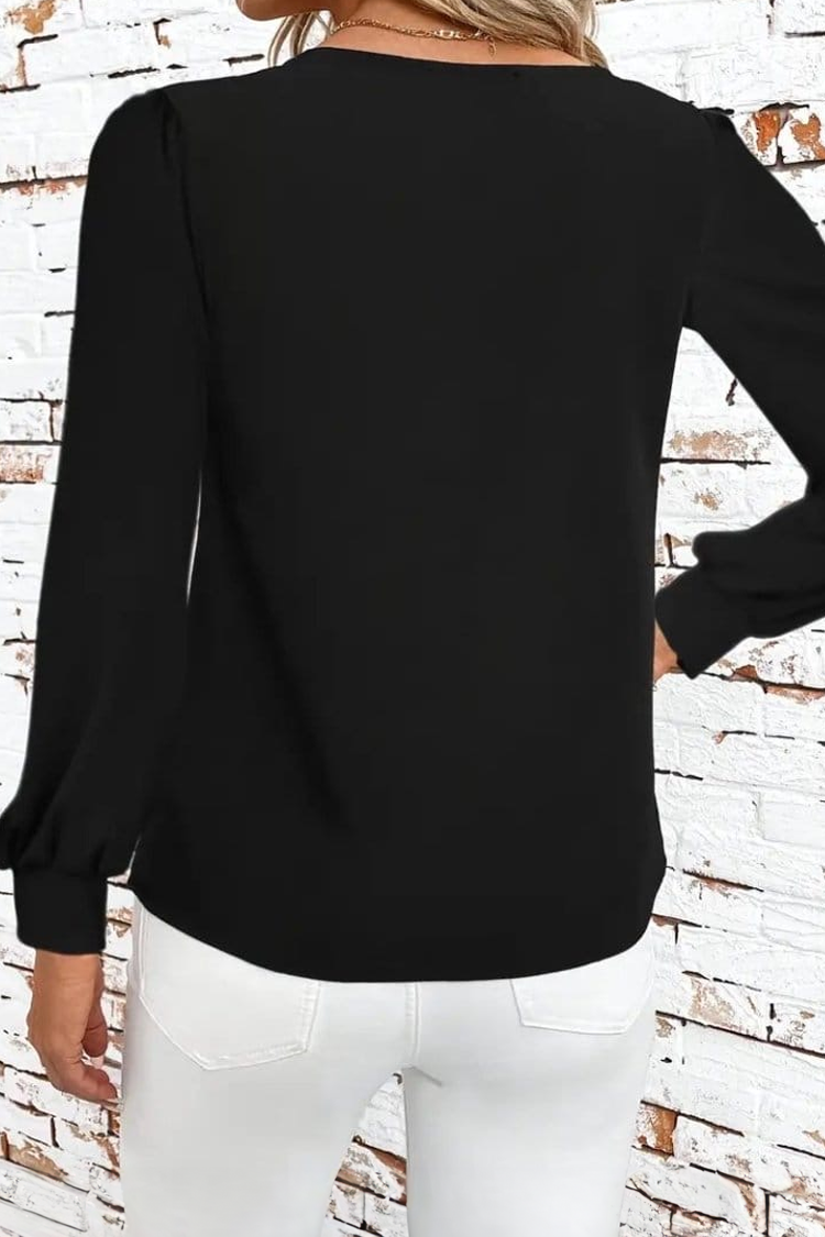 - Η μπλούζα έχει μακριά μανίκια, κομψή ασύμμετρη λαιμόκοψη, μαύρο χρώμα και λευκές λεπτομέρειες.