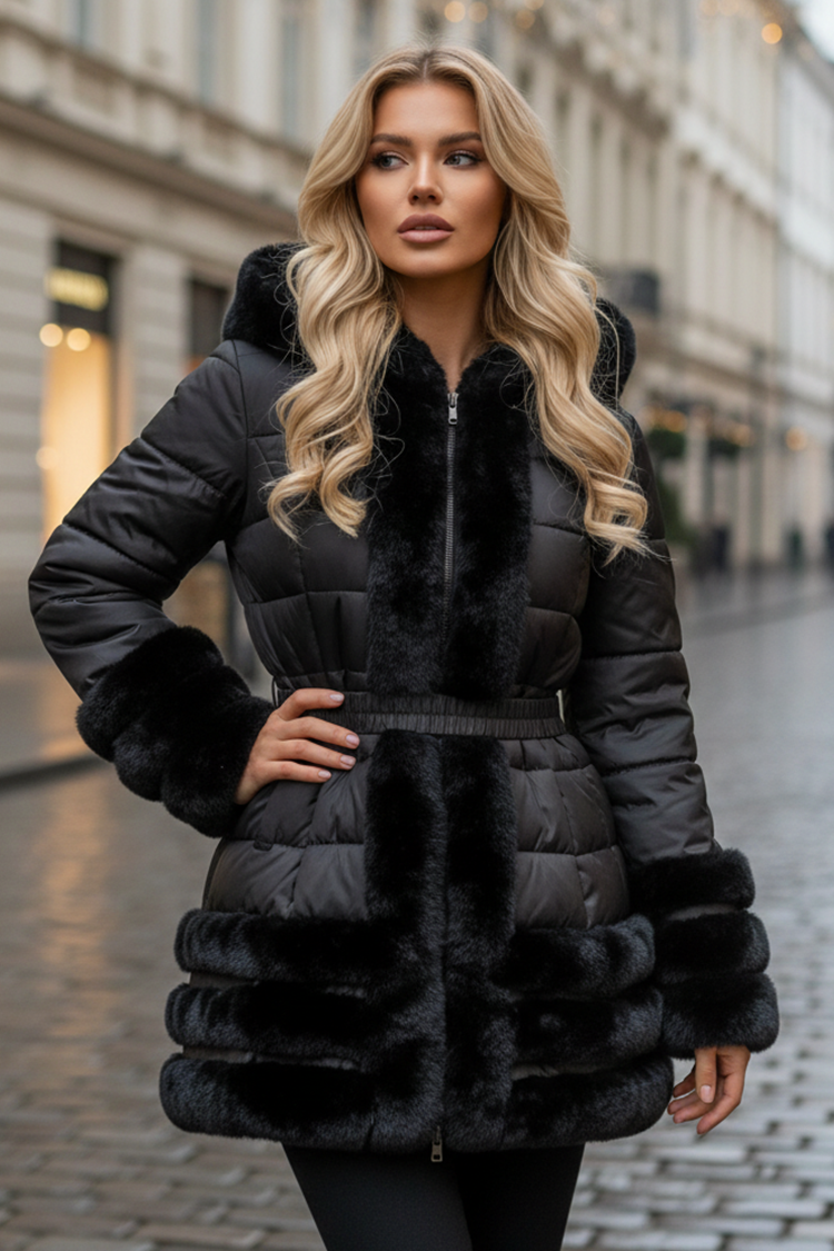 - Το μοντέλο έχει άνετη γραμμή, κλείσιμο με φερμουάρ, ζώνη, ογκώδη κουκούλα και εντυπωσιακά πούπουλα λεπτομέρειες και μανσέτες.