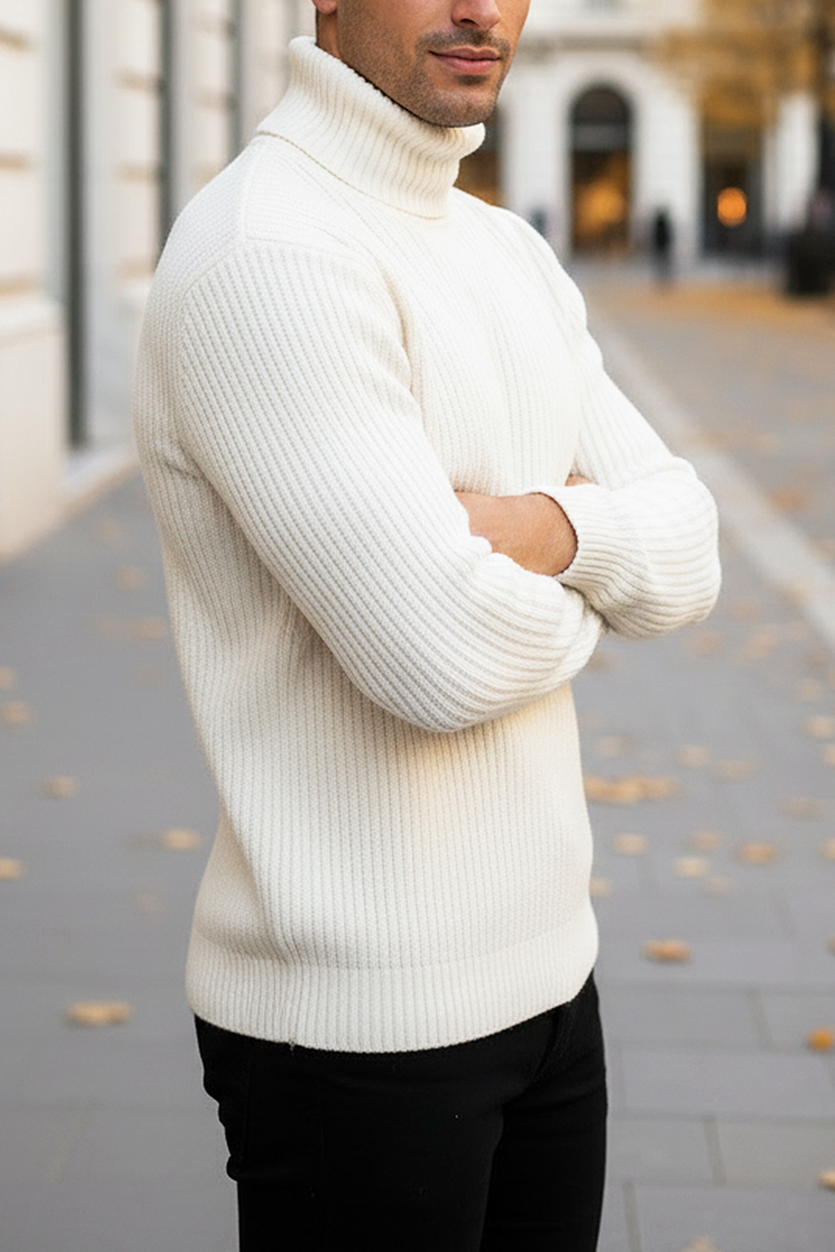 - Ζεστό ανδρικό πουλόβερ με ζιβάγκο και λιτό σχέδιο σε άσπρο χρώμα, κατάλληλο για διάφορους συνδυασμούς.