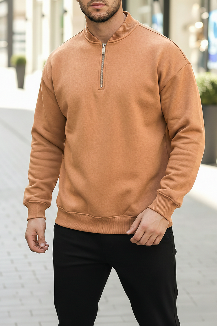 - Δημιουργήστε μια μοντέρνα εμφάνιση με αυτή τη πρακτική μπλούζα με φερμουάρ στην λαιμόκοψη και μακριά μανίκια σε χρώμα ροδάκινο .