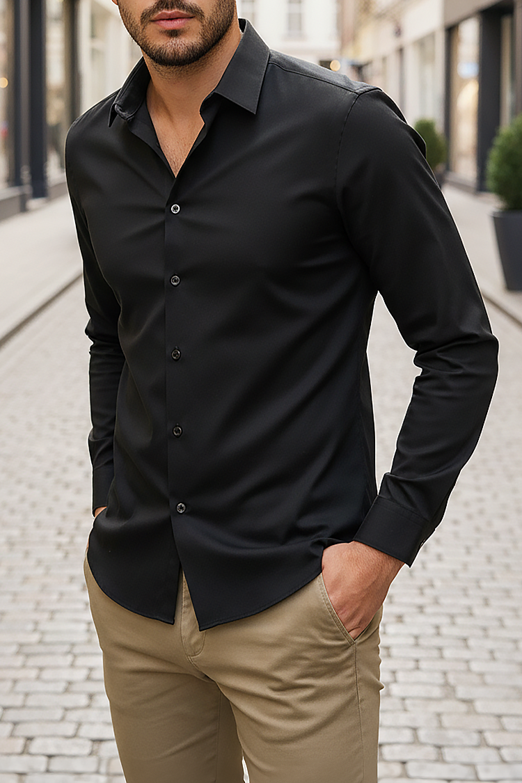 - Κομψό άνδρικό πουκάμισο με κλασικό σχεδιασμό σε μαύρο χρώμα, κατάλληλο για διάφορους συνδυασμούς μόδας.
