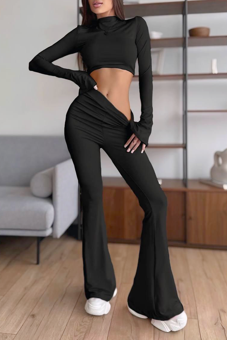 - Η μπλούζα είναι κοντή, ενώ το παντελόνι έχει ψηλή μέση και γραμμή που αγκαλιάζει το σώμα.