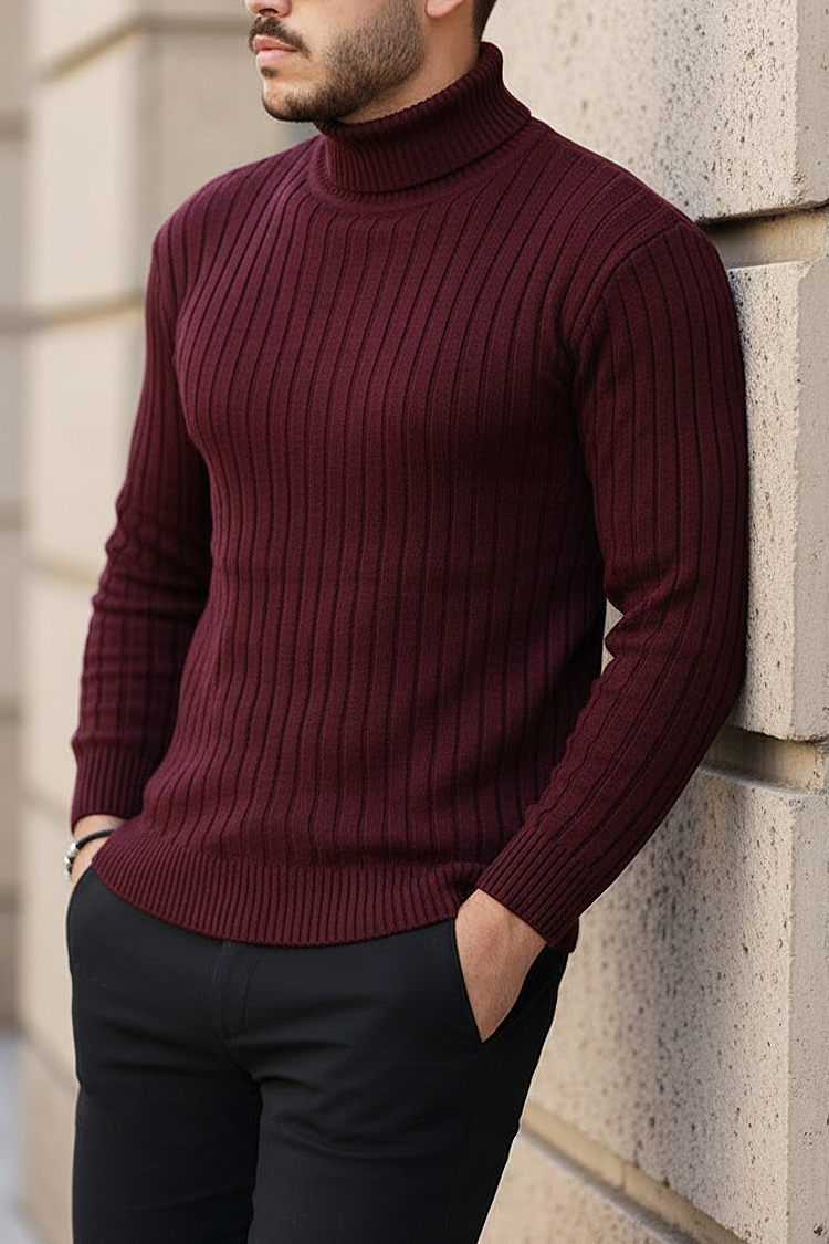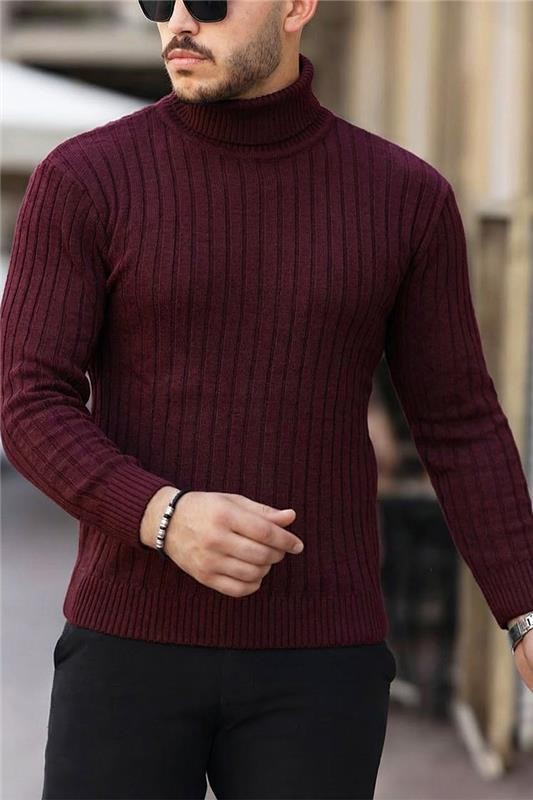 - Άνετο ανδρικό πουλόβερ με ζιβάγκο και ριπ σχέδιο σε μπορντό χρώμα, κατάλληλο για διάφορους συνδυασμούς μόδας.