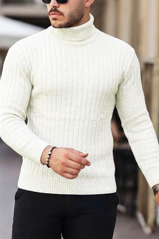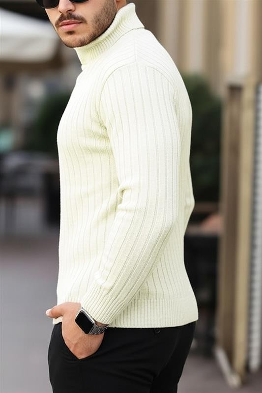 - Άνετο ανδρικό πουλόβερ με ζιβάγκο και ριπ σχέδιο σε εκρου χρώμα, κατάλληλο για διάφορους συνδυασμούς μόδας.