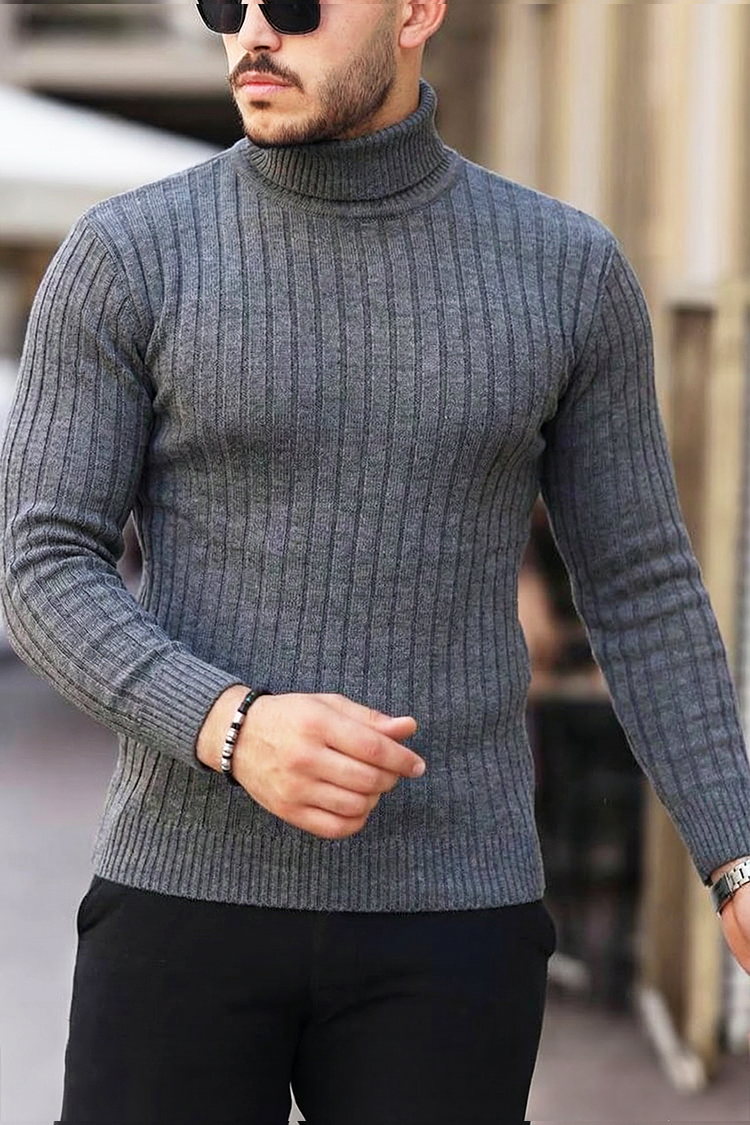 - Άνετο ανδρικό πουλόβερ με ζιβάγκο και ριπ σχέδιο σε χρώμα γραφίτης, κατάλληλο για διάφορους συνδυασμούς μόδας.