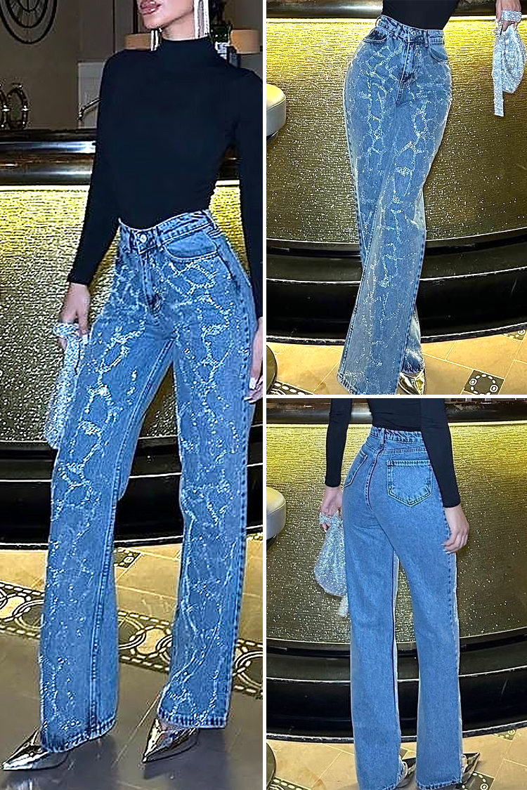 - Το μοντέλο έχει ψηλή μέση, φαρδιά μπατζάκια και γυαλιστερά στοιχεία.