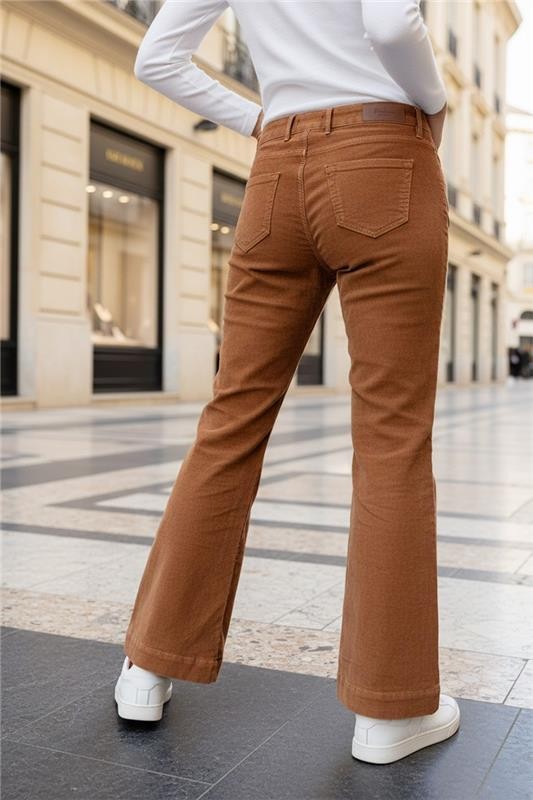 - Μοντέρνο γυναικείο παντελόνι με ψηλή μέση και φαρδιά μπατζάκια σε ανοιχτό καφέ χρώμα.