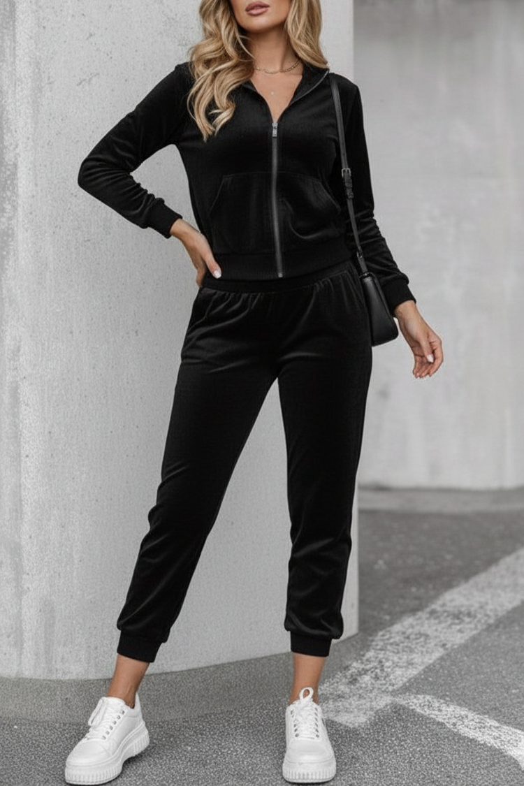- Το φούτερ έχει φερμουάρ και κουκούλα, ενώ το παντελόνι έχει ψηλή μέση και πλαϊνές τσέπες.